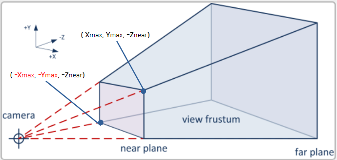 frustum( -X max, X max, -Y max, Y max, Z near, Z far);