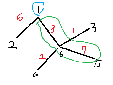 이미 1의 오른쪽에서 가장 큰 거리(가중치)를 구했으니 그 마지막 노드(5) 에서