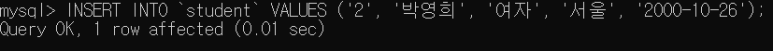 INSERT INTO `student` VALUES ('2', '박영희', '여자', '서울', '2000-10-26');