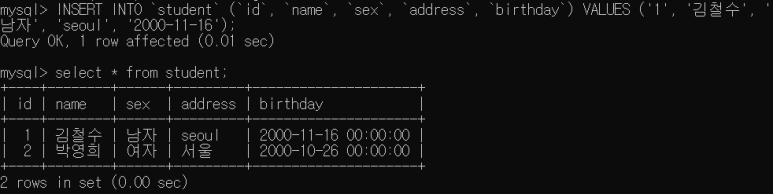 INSERT INTO `student` (`id`, `name`, `sex`, `address`, `birthday`) VALUES ('1', '김철수', '남자', 'seoul', '2000-11-16');