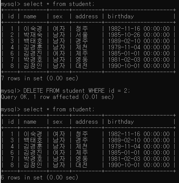 INSERT INTO `student` VALUES (6, '김경진', '여자', '제주', '1985-1-1 00:00:00');
