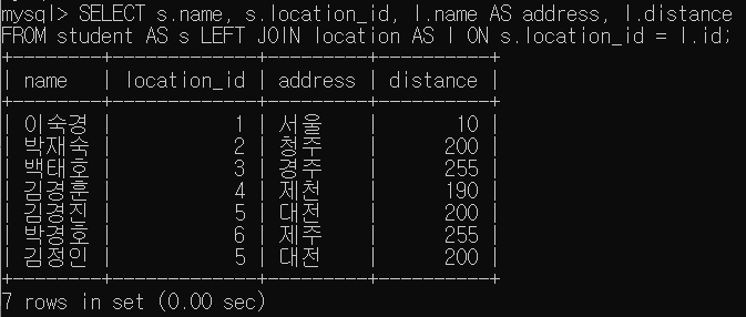 왼쪽에 있는 테이블(현재 student) 을 기준으로해서 오른쪽에 있는 테이블(loacation)의 데이터를 가져온다는 뜻