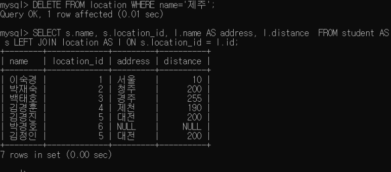 Location 에서 제주를 삭제 후 OUTTER JOIN(LEFT JOIN)과 INNER JOIN의 차이를 비교